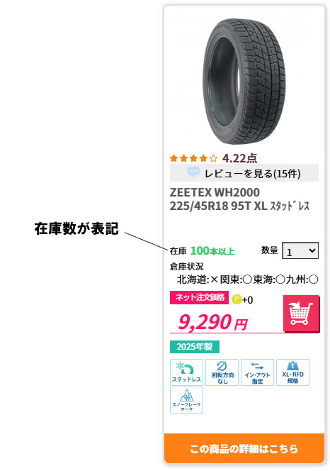 オートウェイのスタッドレスタイヤはほとんどが在庫あり。