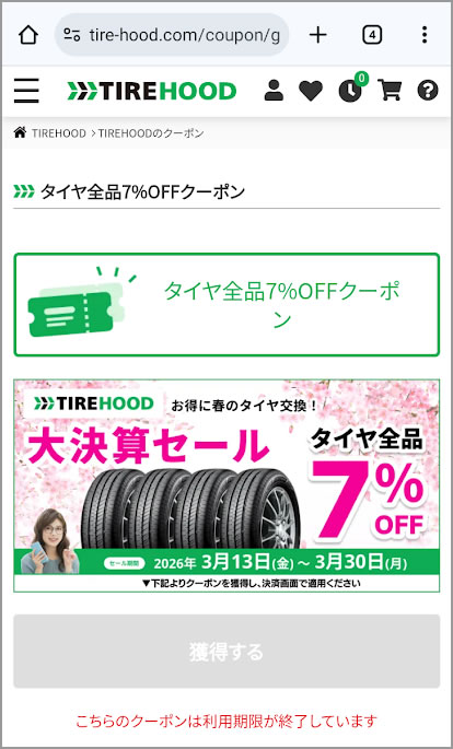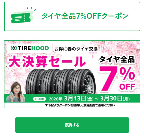タイヤフッドのクーポンは最大7%ですが、滅多に配布されません。