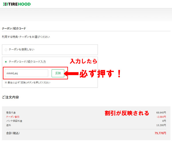 とりあえず下のクーポンコードをコピーしたら、普通にタイヤフッド公式サイトで買い物したら、決済画面の前に入力するところが現れます。