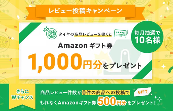 購入したタイヤのレビューを投稿すると、Amazonギフト券がもらえます。