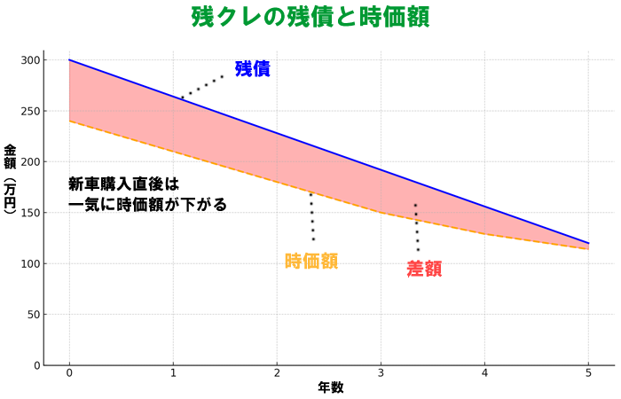 残クレは「最終的な残価を高く設定」することで、月々の支払いを安くしています。そのため契約途中では、車の価値以上に残債が残る構造。