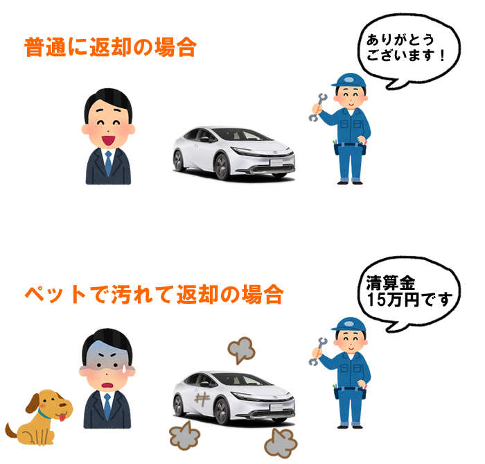 ペットを乗せること自体は禁止ではありませんが、ペットを乗せて車が汚れちゃって、査定額が下がったらその分、返却時に精算になります。