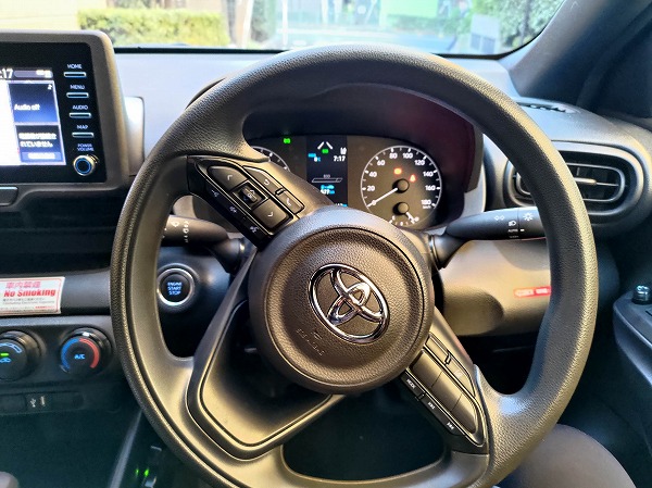 ハンドル周り。かなりスポーティーで、ボタンもいっぱいついてて、ひと目では格上車と変わらない。